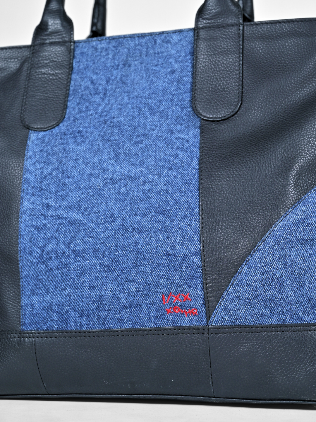 Color - bold fusion of timeless black leather and unconventional denim patchwork