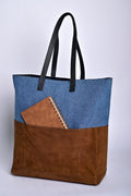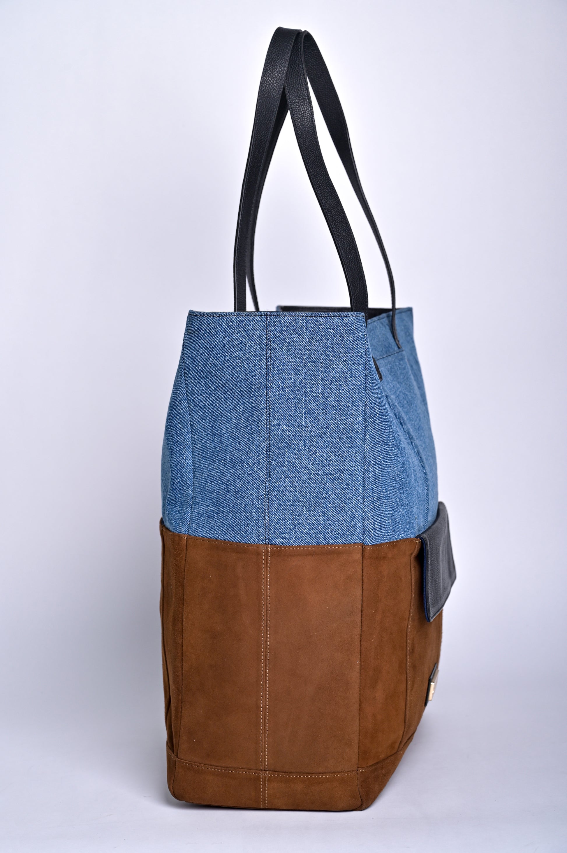 Color - bold composition of rich brown suede, classic denim, and sleek black leather