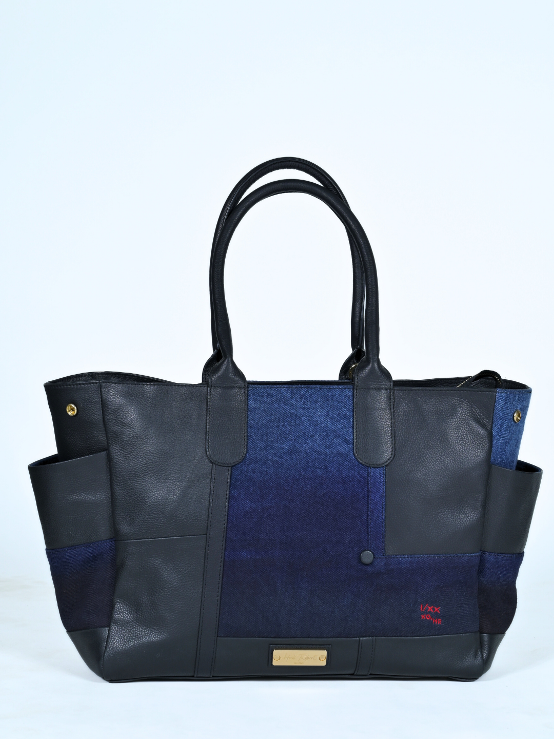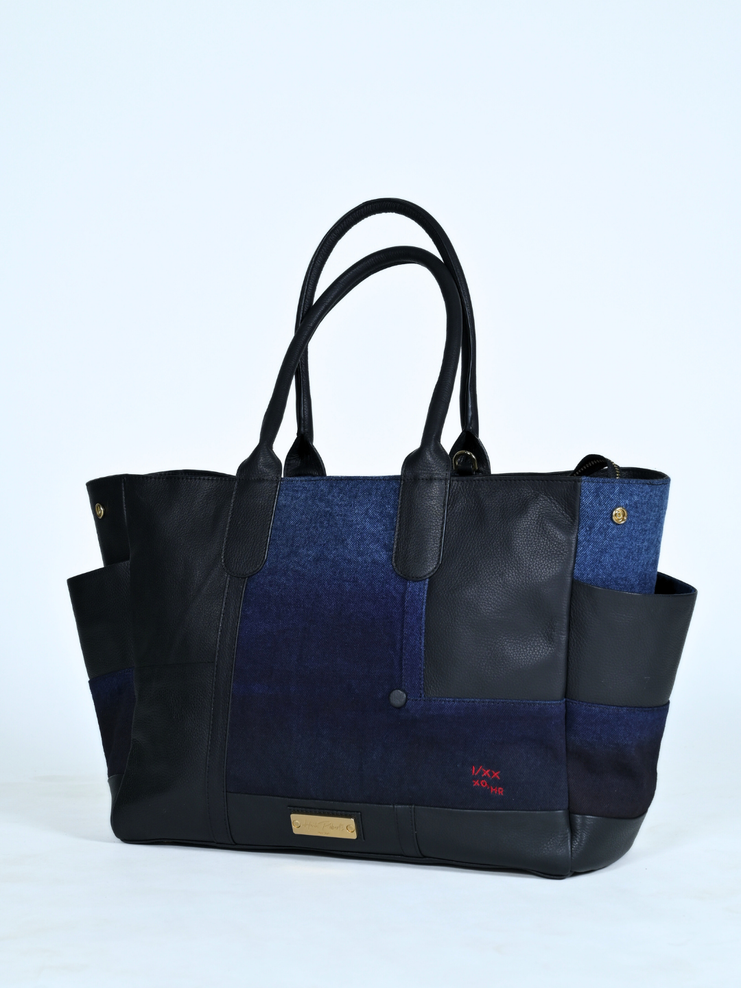 Color - rich black pebbled leather with striking Ombre effect denim panels.