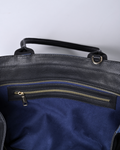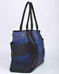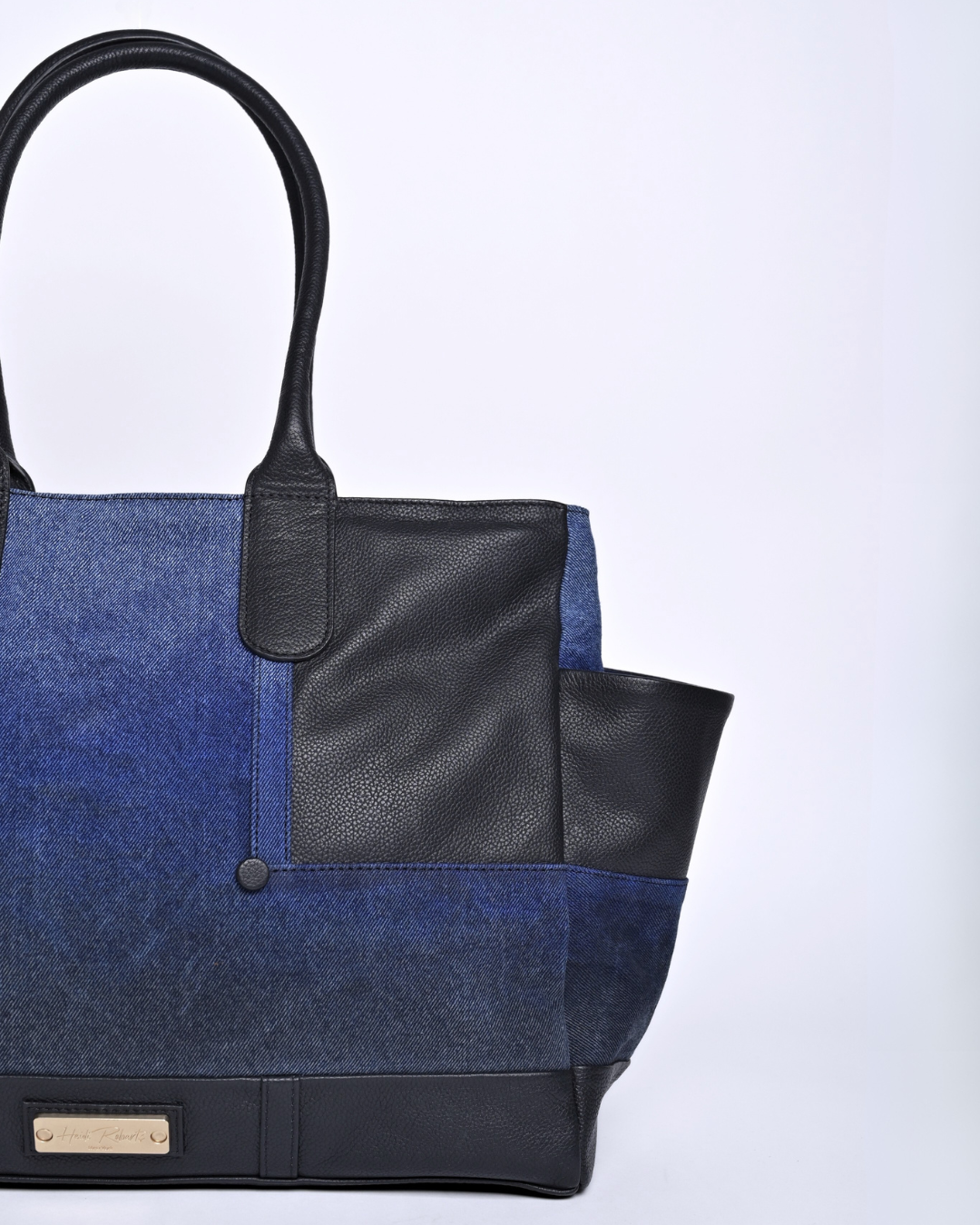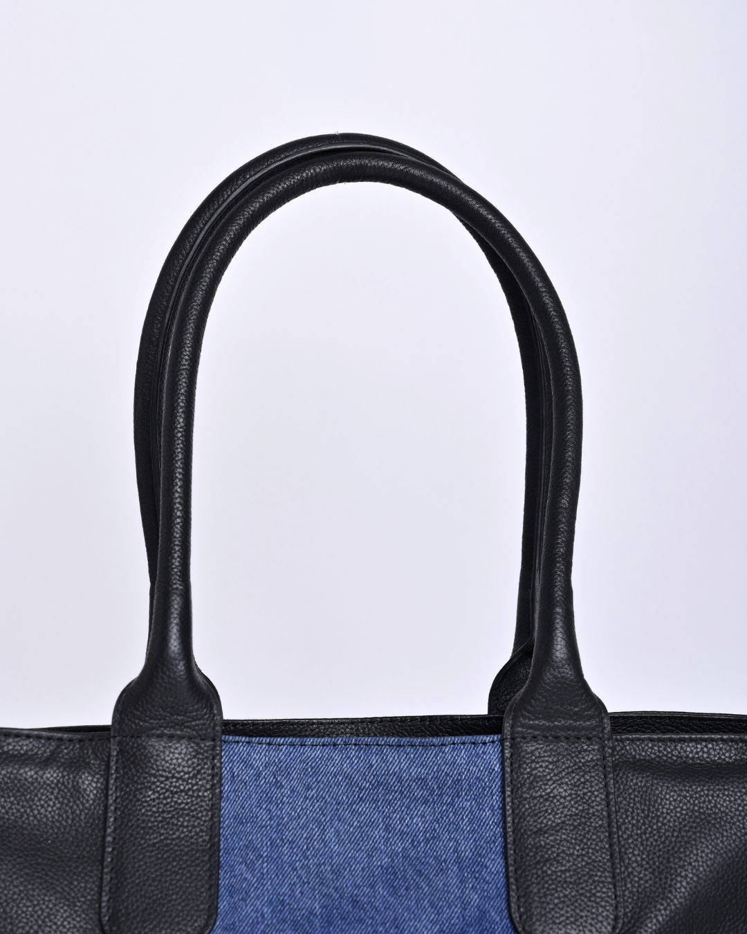 "Color - rich black pebbled leather with striking Ombre effect denim panels.